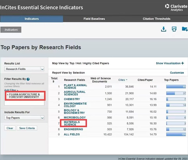 本次统计周期内,学校总被引频次为154142次,ESI全球前1%中国大陆高校总排名122位。材料科学学科被收录SCI论文525篇,其中高被引论文3篇,总被引次数8556次,篇均被引频次16.30次。全球共有1260个机构进入该学科前1%,我校位列全球机构1219位,中国大陆高校258位。另外,我校植物与动物科学位列全球第180位,排名提升了9个名次。农业科学位列全球第160位,前进了2个名次。