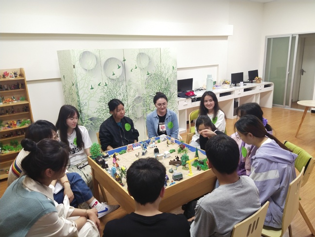 在沙盘游戏活动环节,同学们依次将挑选出的模具放置在沙盘上,并利用沙子调整地形环境,共同创作出一个沙盘作品。随后,大家围坐沙盘周围畅所欲言,指导老师根据每个同学摆放的不同人物、场景等做了分析和解读,同学们在真诚的交流中敞开心扉、感知自己。