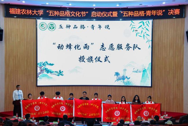 下午14时许,唐含宇宣布“五种品格文化节”正式开幕,与会老师向五支“动蜂化雨”志愿服务队授旗。在启动仪式上,贺鹏致开幕词。他强调,青年学子要从学校艰辛奋斗的办学历史和农林先辈们可歌可泣的优秀事迹中汲取经验与力量,在党的二十大精神指引下,传承和发扬好耕牛的拓荒、骏马的争先、小草的奉献、蜜蜂的勤勉、青松的顽强等“五种品格”精神,怀抱理想又脚踏实地,敢作敢为又善作善成,以青春之我投身农业农村现代化建设,让青春在全面建成社会主义现代化国家的火热实践中绽放绚丽之花。