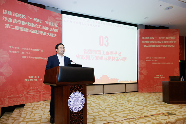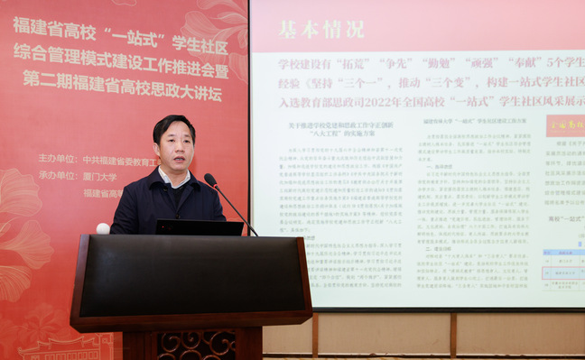 3月30日,由中共福建省委教育工委主办、厦门大学承办的全省高校“一站式”学生社区综合管理模式建设工作推进会暨第二期全省高校思政大讲坛在厦门大学翔安校区召开。省委教育工委副书记、省教育厅党组成员林生出席会议并讲话,各设区市委教育工委分管领导、各省(部、厅)属普通高校分管领导及相关职能处室负责人、辅导员等通过线上线下相结合方式参会。我校党委副书记曾华平代表学校作交流发言。