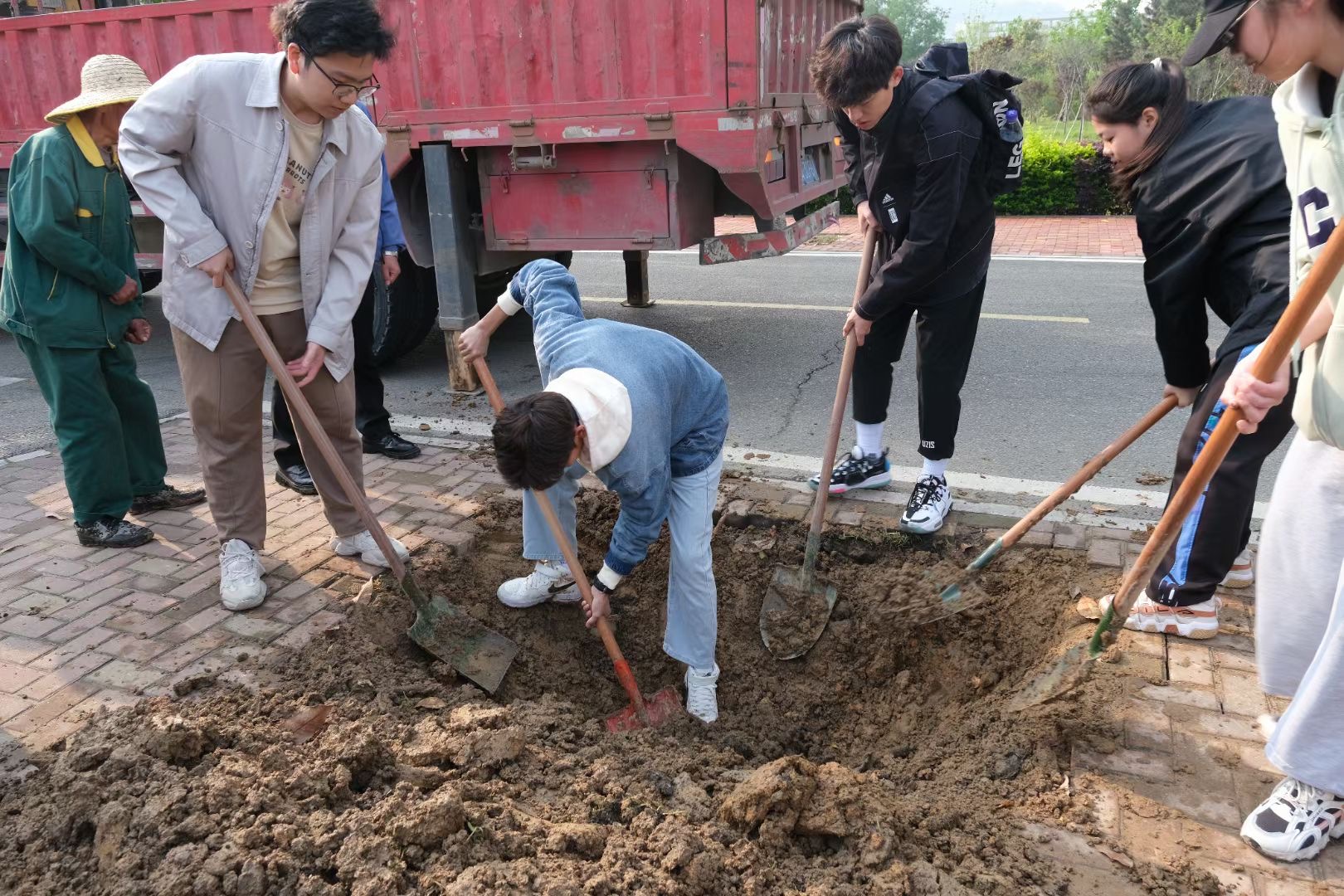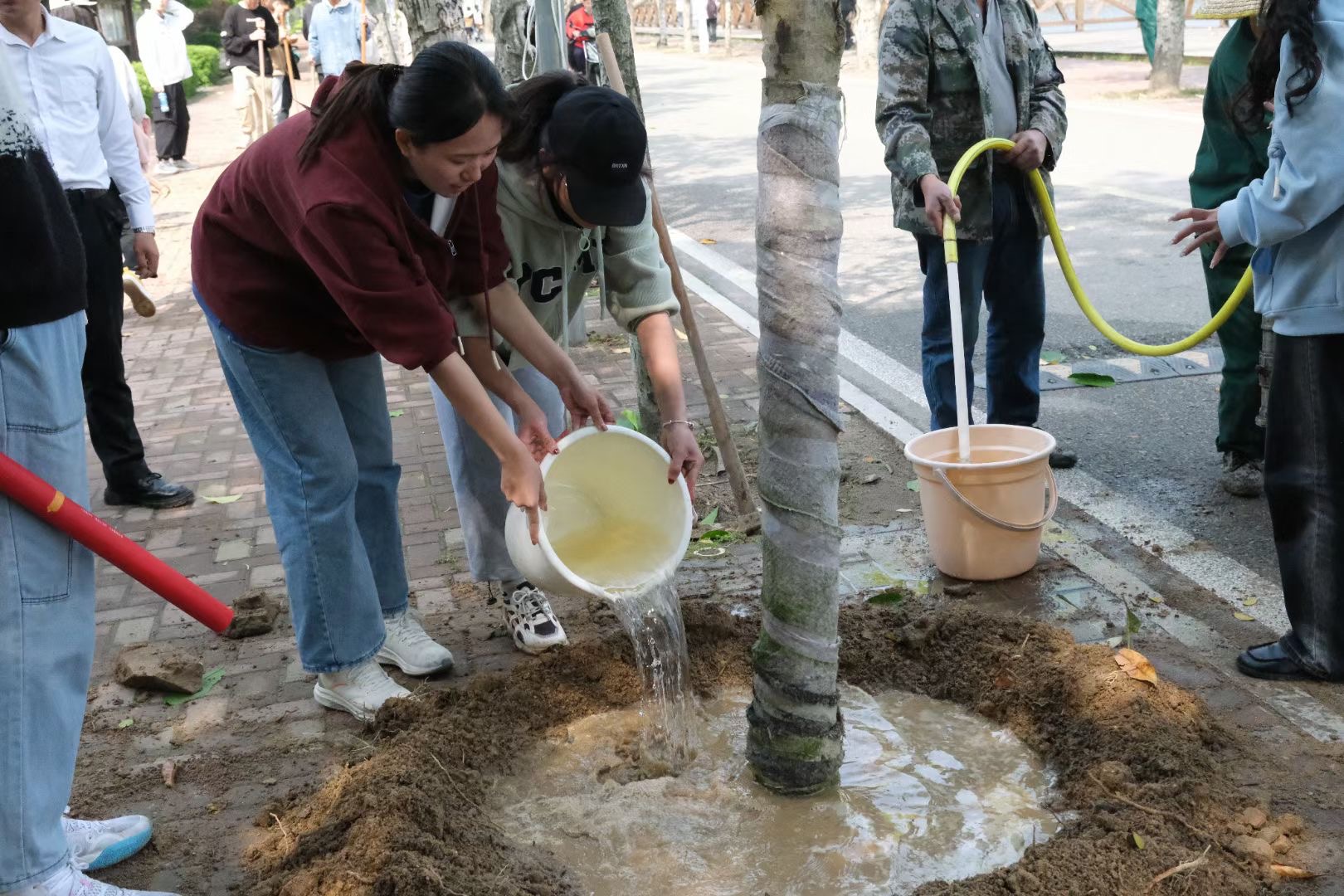 在校后勤管理处校园园林绿化科老师和工人师傅的指导下,同学们挥锹铲土,扶树正苗、培土围堰、提水浇灌,构成了春日里一幅动人的劳动画卷。大家分工协作,相互配合,合力补种校园主干道和西门喷泉广场周边新树苗。