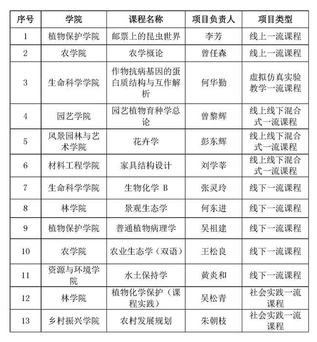 日前,教育部公布第二批国家级一流本科课程认定结果,我校13门课程入选第二批国家级一流本科课程认定结果名单,其中,线上一流课程2门,虚拟仿真实验教学一流课程1门,线下一流课程5门,线上线下混合式一流课程3门,社会实践一流课程2门。至此,我校共获批国家级一流本科课程49门,位居全国普通高校44位,全国农林院校第2位,福建省高校第3位。