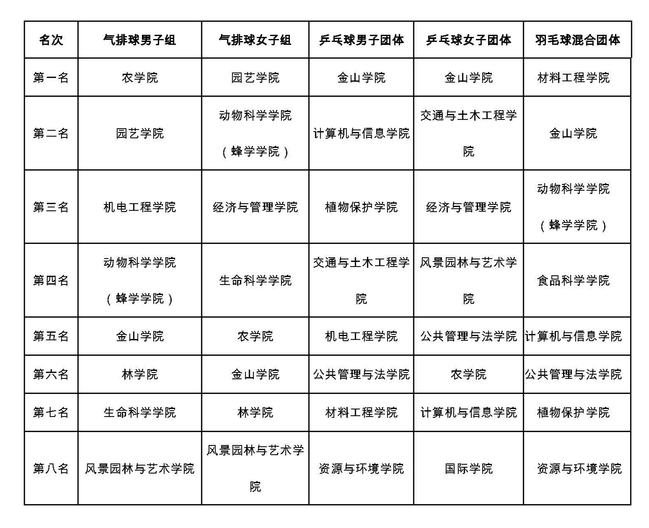 乒乓球团体赛有20个学院的20支男子代表队、19支女子代表队参赛,金山学院获得男子组和女子组双冠军。
