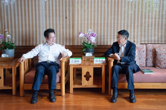 王建南代表学校对孙杰光一行表示欢迎,简要介绍了学校基本情况以及近年来在党建思政、人才引育、学科建设等方面的建设情况。他表示,吉林财经大学在经济管理、绿色金融、碳中和等研究领域具有良好基础,希望双方进一步加强交流,为服务国家“双碳”战略和生态文明建设做出更大贡献。孙杰光简要介绍了此行调研的目的,对我校近年来在党建思政、学科交叉融合、集体林权制度改革研究、菌草援外等方面取得的显著成效给予高度评价,希望借鉴我校的好经验好做法,进一步深化合作,共同推动两校高质量发展。