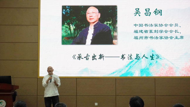 吴昌钢为活动做题为《承古出新-书法与人生》的主题分享,结合自己数十年研治诗书画印的感受,从名家作品的书法技艺、表现形式、内涵文化等方面勉励青年学生要涵养人格修为,以丰富的学识为支撑,文化思想为灵魂,不断精进技艺。福州市书法家协会副主席林利敏做题为《浅谈书法的学习与创作》主题分享,为同学们分享了练习书法的经验;交通与土木工程学院教授冯辉荣做《中国书画与文化自信》主题分享,展示了古代名家的书画作品。