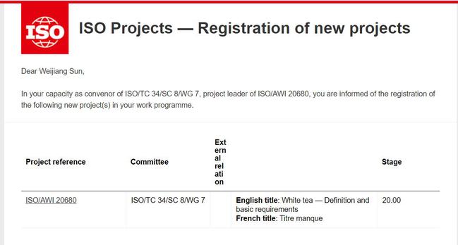 近日,由我校牵头研制的国际标准ISO 20680《White tea - Definition and basic requirments》已正式获得批准立项。该标准是继我校在ISO/TC34/SC8“茶叶”分委员会承担ISO 20716《乌龙茶-定义和基础特征》国际标准研制并于2022年9月正式发布后获得的新突破。该项目由园艺学院孙威江教授担任召集人和项目负责人。
