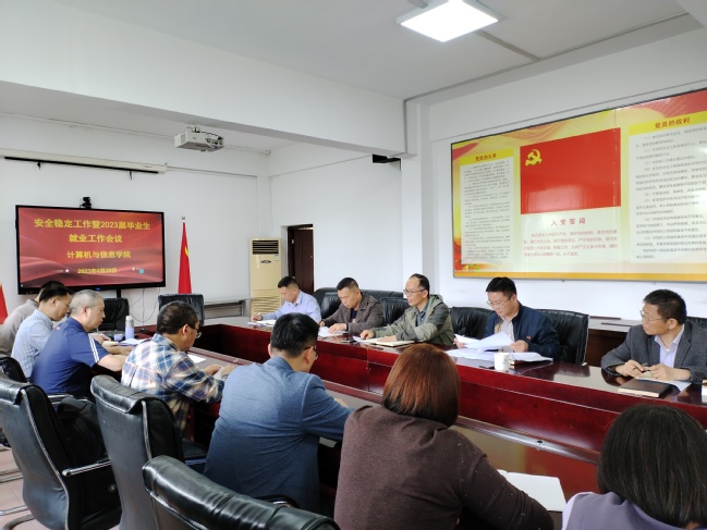 4月28日下午,计算机与信息学院在302会议室召开安全稳定工作暨2023届毕业生就业工作会议,学院党委委员、党政领导、系主任、科级干部参加了会议,会议由学院党委书记钟一文主持。