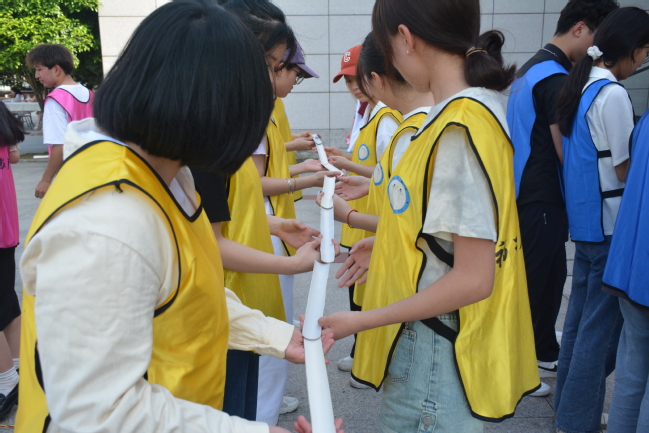 接下来进行的游戏项目是鼓动人心,各组队员需要用一只拴着许多绳子的额鼓去接弹在空中的网球,通过不断尝试的成功来激励人心,让同学们充分体会团队协作以及游戏对抗中永不放弃的重要性。最后进行的项目是团队动力圈,各组同学围成圈,手握“同心绳”,大家齐喊口号,整齐划一,尽情挥洒着汗水。此项活动不仅增强了同学们挑战自我的信心,而且提升了同学之间、师生之间的团队整体凝聚力,开发了团队协作的新潜能。