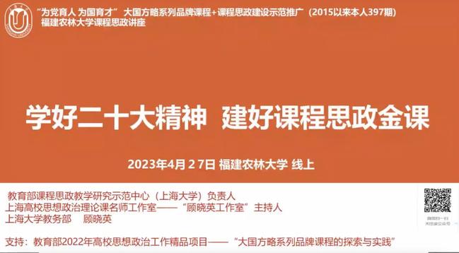 近日,上海大学教务部副部长、教育部课程思政示范中心(上海大学)负责人、上海高校思政课名师工作室“顾晓英工作室”主持人顾晓英教授应邀为我校作“学好二十大精神 建好课程思政金课”的线上思政课程建设报告,报告会由校教师教学培训师、马克思主义学院黄秀玲副教授主持。