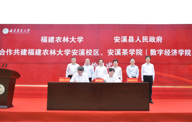 签约揭牌仪式上,兰思仁、刘永强分别代表我校和安溪县人民政府签署了合作共建协议。吴伟平、黄景春、王建南、兰思仁、杨江帆、林庆藩、吴毓舟、刘永强、梁金良、陈剑宾等领导共同为安溪校区、安溪茶学院(数字经济学院)及光电与网络工程实验室、“三茶”统筹发展研究院揭牌。