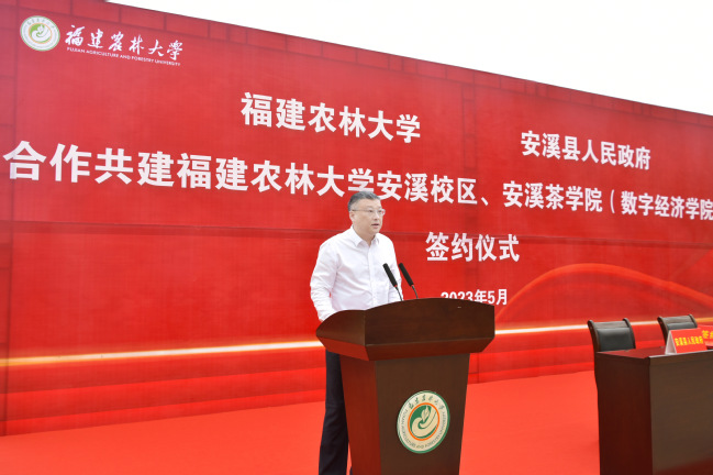王建南在致辞中指出,学校与安溪县十年来携手合作共建安溪茶学院,探索了优势互补、协作办学的新模式,实现了安溪校区办学从无到有、从有到优的新飞跃。他代表学校向长期以来关心支持开云网页版安溪校区建设、安溪茶学院办学的各级领导和社会各界表示衷心感谢。他强调,站在办学十周年的重要节点上,校地双方经过深入沟通、多方论证,决定在安溪茶学院的基础上组建数字经济学院,推动安溪校区发展实现转型升级。他希望,通过校地进一步深化合作,着力把安溪茶学院和数字经济学院建设成为产学研协同创新示范基地和数字经济领域人才培养高地,把安溪校区建设成为多主体参与、多学科交融的现代化校区。