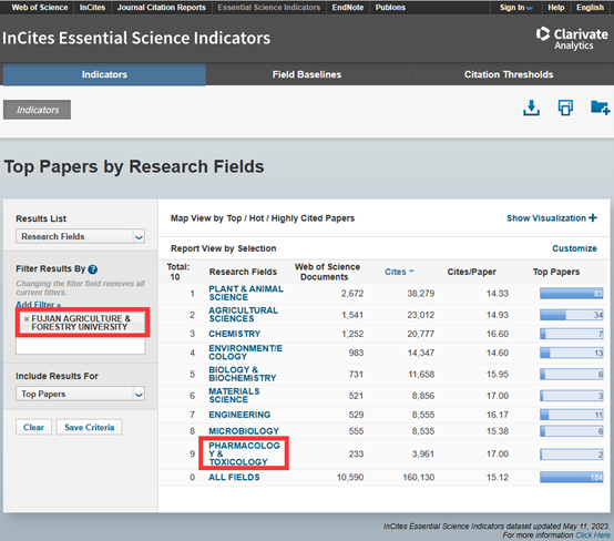 “药理学与毒理学”学科被收录SCI论文233篇,总被引次数3961次。全球共有1172个机构进入该学科前1%,我校位列全球机构第1134位。另外,农业科学位列全球第142位,前进了18个名次,进入1.261‰。生物学与生物化学、化学、工程学等其他ESI前1%学科排名也均有不同程度的进步。