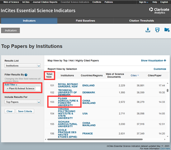 我校“植物学与动物学”学科于2016年3月首次进入ESI前1%,进入时该学科ESI论文仅423篇,被引频次2238次,经过7年时间的稳步发展,“植物学与动物学”被收录SCI论文2672篇,引频次为38279次。全球共有1634个机构进入该学科前1‰,我校位列全球机构第153位,排名比上轮提升了27名,进入0.94‰。
