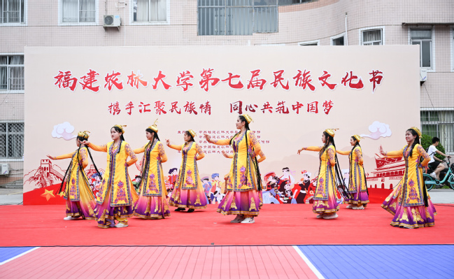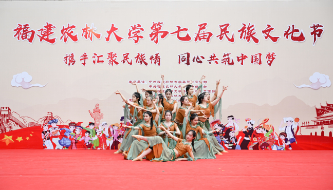 活动现场,民歌悠扬,民舞飘逸。舞台上,同学们身着极具地域特色的民族服饰,佩戴着绚丽多彩、美轮美奂的纹饰,用轻盈的舞姿和激昂的歌声点燃了全场氛围。敦煌乐舞《沁莲》展现了古丝绸之路各民族音乐舞蹈文化的碰撞和交流;彝族民歌《带我到山顶》唱出了游子的思乡之情;诗朗诵《我的祖国》表达了各民族同学们对祖国壮丽山河的热爱和对美好生活的向往;《衣冠里的华夏》民族特色服饰展示让现场观众深深感受了民族服饰中所蕴含的丰富文化内涵与文化艺术价值;在场师生合唱《相亲相爱》表达了五十六个民族血浓于水的骨肉情深,奏响了各民族师生对伟大祖国的真挚感情。