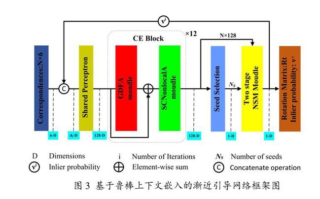 现有的点云配准网络都使用一种单序列结构的学习框架,即特征嵌入输出特征层的输入仅仅来自上一层单序列结构的输出,并不能充分捕获复杂场景中的全局上下文信息。这将使网络保留过多的离群值,导致点云配准结果不够准确,如图2(a)所示。因此,该研究首先提出了一个上下文嵌入(Contextual Embedding,CE)块,从同一层的不同方面充分捕捉上下文信息,并利用通道-空间注意力机制加强对内点和重要通道空间的表示,以利于对应关系的学习。然后,本文采用提出的两阶段神经光谱匹配模块来计算每个对应关系的内点概率,并估计一个从粗到细的暂定转换模型,如图2(b)所示。为了进一步排除离群值,优化对齐细节,该研究提出了一种新的点云配准网络,称为基于鲁棒上下文嵌入的渐进引导网络 PG-Net(Progressive Guidance Network via Robust Contextual Embedding)。PG-Net 利用学习到的内点概率来进一步引导初始对应关系的分类。如图2(c),经过内点概率的渐进引导,PG-Net 可以识别并保留更多的内点,输出更准确的姿态估计细节对齐结果。图3为本文所提出的基于鲁棒上下文嵌入的渐近引导网络框架图。