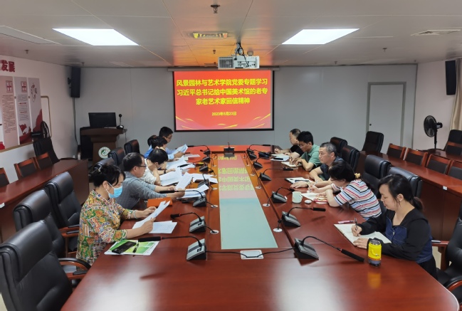 5月21日,在中国美术馆建馆开放60周年之际,习近平总书记给中国美术馆的老专家老艺术家回信强调“在高质量收藏高水平利用高品质服务上下功夫,努力打造国家级乃至世界级艺术殿堂”。5月23日下午,风景园林与艺术学院党委专题学习习近平总书记回信精神,会议由学院党委书记雷国铨主持,学院领导班子成员和科级干部参加学习。