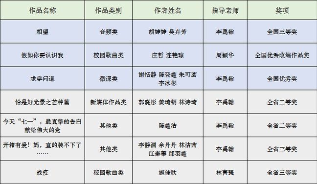 日前,由教育部思想政治工作司、中央网信办网络社会工作局联合举办的第六届全国大学生网络文化节和全国高校网络教育优秀作品推选展示活动,以及由福建省委教育工委、福建省委网信办联合举办的第六届全省大学生网络文化节和全省高校网络教育优秀作品推选展示活动两项赛事评选结果分别揭晓。我校共有7项作品获奖,其中获得第六届全国大学生网络文化节和全国高校网络教育优秀作品推选展示活动三等奖1项、优秀奖2项;获得第六届全省大学生网络文化节和全省高校网络教育优秀作品推选展示活动二等奖2项、三等奖2项。