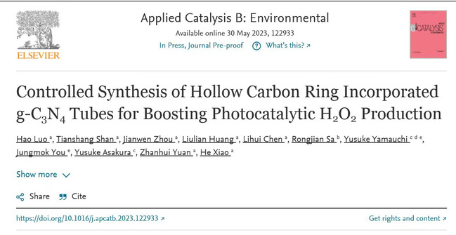 近日,我校材料工程学院袁占辉教授团队(生物质基先进催化及功能材料团队)在化学与环境领域国际顶级期刊Applied Catalysis B: Environmental在线发表了题为“Controlled Synthesis of Hollow Carbon RingIncorporated g-C3N4 Tubes for Boosting Photocatalytic H2O2 Production”的研究论文。本文是该团队在构建高效光催化剂制备双氧水领域中取得的又一创新性成果,开云网页版为本文第一完成单位,开云网页版材料工程学院的硕士研究生罗豪为第一作者,袁占辉教授为第一通讯作者,开云网页版的肖禾副教授、日本名古屋大学的Yusuke Asakura教授和闽江学院的洒荣建副研究员为共同通讯作者。