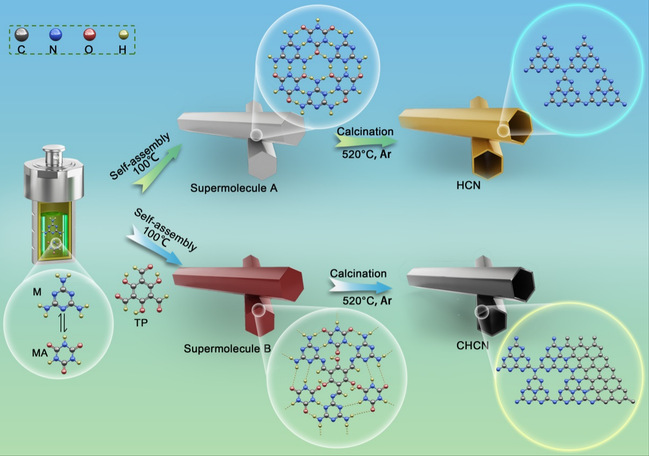 本研究利用超分子自组装的策略,在碱性条件下,水热诱导三聚氰胺(M),三聚氰酸(MA),三醛基间苯三酚(TP)实现超分子前驱体的制备(图1)。因TP具有大量醛基(-CHO)及羟基(-OH)官能团,从而能够提供大量的氢键供受体。同时,其醛基能够在热处理过程中与M所含氨基发生希夫碱共价键合反应。因此,在氢键-共价键双重作用力下,TP能够完美地与M和MA构建一种新型超分子自组装体。后经高温煅烧,成功在中空管状氮化碳分子层面上原位构建TP衍生共轭芳香碳环(Cring),即石墨相氮化碳-碳环异质结(CHCN)。其中Cring能够在g-C3N4分子面内形成有效内建电场,电场指向为Cring至g-C3N4,从而实现光生载流子的高效迁移、分离。与此同时,通过优化Cring的添加量,成功开发出一种基于一步2e-ORR策略,增强两步2e-ORR路径高效光催化制备过氧化氢的催化剂。在10%的乙醇水溶液中,CHCN-0.02具有最优的光催化制备H2O2性能(1.58 mmol L -1 h -1),在波长为420 nm处拥有28.1%的量子效率,其性能高于大部分已报道的光催化制备H2O2的研究。综上所述,CHCN其电子转移路径以及光催化制备过氧化氢机理图可表示如图2所示。