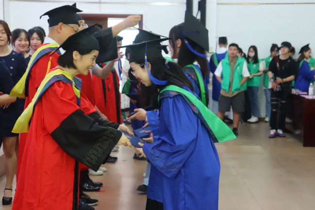 主席台上就座的领导、老师为2023届全体毕业生拨穗正冠、颁发证书、合影留念,并送上寄托着希望和祝福的蛋糕。