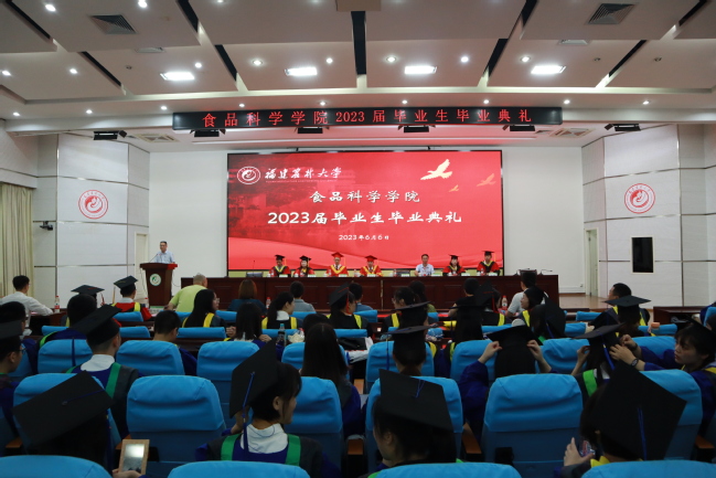 6月6日下午,食品科学学院2023届毕业生毕业典礼在禧强楼学术报告厅隆重举行。典礼由学院党委书记苏健涵主持,副校长郑宝东,学院党政班子成员,教师代表,辅导员及全体毕业生出席仪式。