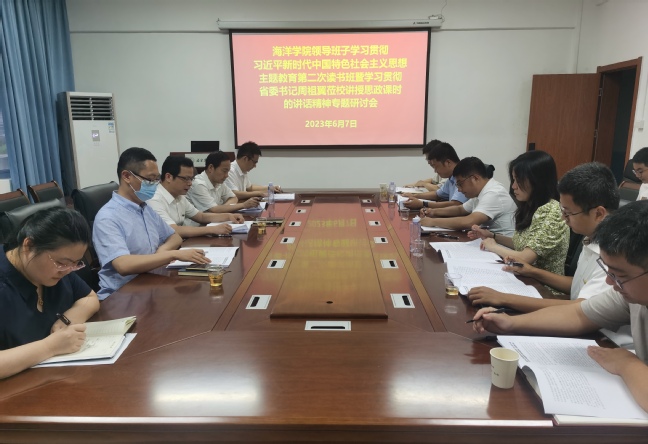 6月7日,海洋学院党委在学院会议室召开学习贯彻习近平新时代中国特色社会主义思想主题教育第二次读书班暨学习贯彻省委书记周祖翼莅校讲授思政课时的讲话精神专题研讨会。学院领导班子成员、党支部书记、各教学系负责人、科级干部、党员代表、教师代表等参加。会议由学院党委书记黄毅军主持。