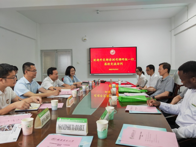 6月6日下午,外交部非洲司参赞、二级巡视员贺萌一行在省外办领事处的陪同下莅校调研,实地参访我校国家菌草工程技术研究中心(以下简称菌草中心)并参加座谈会。副校长郑宝东在菌草中心会议室主持座谈交流,国际合作与交流处、菌草中心、国际学院相关负责人和留学生代表参加座谈。