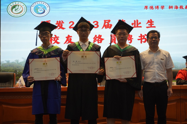 随后,黄毅军为2023届校友联络员颁发了聘书,陈新华教授、赵超教授、张子平教授为2022届全体毕业生拨穗正冠、颁发证书,并合影留念。
