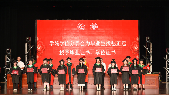 最后,举行了毕业生拨穗正冠仪式,主席台上的院学位分委员会、教授委员会成员为全院2023届毕业生拨穗正冠,授予毕业证书、学位证书。39名返校参加毕业典礼的2020届和2021届毕业生也参加了仪式。