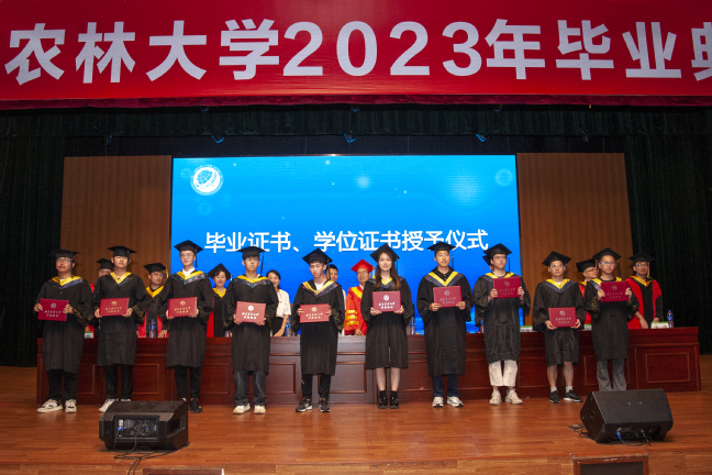 毕业典礼上,院领导、各系负责人为2023届全体毕业生拨穗正冠、颁发证书,并合影留念。