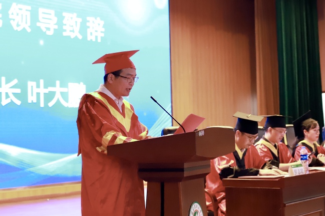 院长叶大鹏致辞,向顺利完成学业的2023届全体毕业生表示热烈的祝贺和美好的祝愿。向辛勤教导学生成长成才的老师和家长表示最衷心的感谢,并对全体毕业生提出三点希望:一要磨练坚毅品格。二要厚植爱国情怀。三要勇担时代重任。