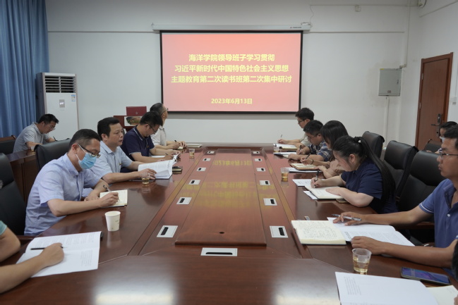6月13日下午,海洋学院党委在学院会议室召开学习贯彻习近平新时代中国特色社会主义思想主题教育第二次读书班第二次集中学习研讨会。学院领导班子成员、党支部书记、各教学系(实验室)负责人、科级干部、辅导员等参加。会议由学院党委书记黄毅军主持。