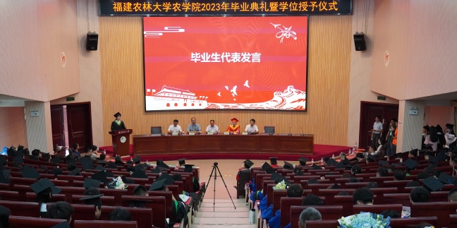 典礼仪式在庄严的国歌声中开始。洪诚代表学院向2023届全体毕业生表示祝贺,向老师们的辛勤付出和学生家长们对学院工作的支持表示敬意和感谢,勉励毕业生们要永远听党话跟党走,弘扬和践行“崇德、尚学、传承、创新”院训精神,厚植爱农情怀、练就兴农本领,在乡村振兴的大舞台上交出强农报国的“青春答卷”。