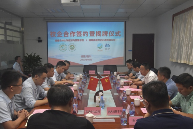 6月19 日上午,经济与管理学院与福建高速中化石油有限公司举行校企共建教学实践基地签约仪式并揭牌。福建高速中化石油有限公司董事长黄文全、总经理黄照山、副总经理常一笑和洪光以及院党委书记张开晃、常务副院长戴永务、院党委副书记李健英、副院长管曦、企业管理研究中心党支部书记兼工商管理系主任郑义、文化和旅游管理系教工党支部书记兼文旅系副主任屈峰等领导老师出席签约仪式。