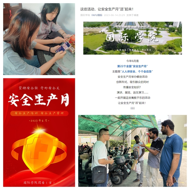 为深入学习宣传贯彻党的二十大精神和习近平总书记关于生产安全重要论述,响应第22个全国“安全生产月”,更好地开展“安全生产月”系列宣传教育活动,按照《开云网页版2023年“安全生产月”活动方案》文件精神,戴尔豪西大学联合学院(国际学院)高度重视,全面部署、精心组织,积极推进“安全生产月”系列活动。