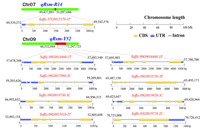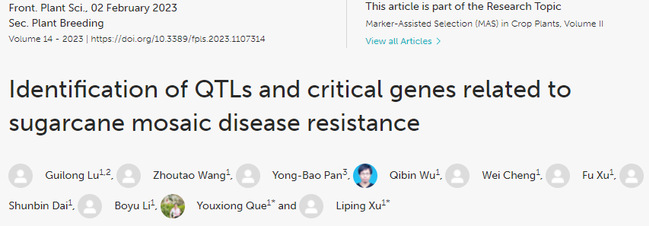 (2)在《Frontiers in Plant Science》发表题为“Identification of QTLs and critical genes related to sugarcane mosaic disease resistance”的研究论文。该研究首次利用对花叶病抗性不同的甘蔗主栽品种为亲本杂交后代为材料,采用自然感染和人工接种进行综合评价,明确该性状为高度可遗传的数量性状(H2 = 0.85),并鉴定到免疫、高抗、中抗、感病和高感子代。进一步,利用甘蔗100K SNP芯片构建的高密度图谱,定位到7个与花叶病抗性相关QTL,其中1个主效QTL即qRsm-Y12,可解释17.10%的表型变异。最后,通过比较基因组和转录组分析,鉴定到110个抗病候选基因,并获得了9个甘蔗抗SCMV和SrMV的潜在关键基因。研究结果为解析甘蔗对花叶病的抗性机制及进一步开展甘蔗花叶病抗病分子育种奠定了良好的基础,并提供了科学依据。开云网页版农业农村部甘蔗生物学与遗传育种重点实验室、国家甘蔗工程技术研究中心/农学院2018级博士研究生路贵龙为该论文的第一作者;阙友雄研究员和许莉萍研究员为共同通讯作者。
