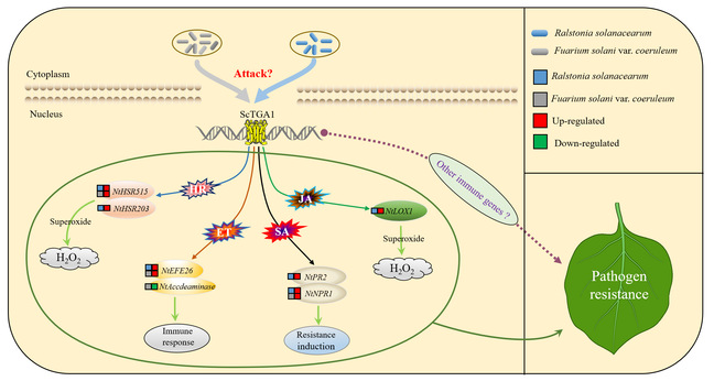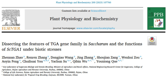(3)在《Plant Physiology and Biochemistry》发表题为“Dissecting the features of TGA gene family in Saccharum and the functions of ScTGA1 under biotic stresses”的研究论文。该研究聚焦甘蔗SsTGA基因家族的挖掘、分类、进化、结构特征和表达模式等开展研究。作者还鉴定了一个ScTGA1基因,揭示了过表达该基因可能通过影响过敏反应相关基因的表达、叶片H2O2含量积累以及细胞坏死,从而调控植物对病原菌侵染的防御反应。最后,提出了甘蔗ScTGA1蛋白功能作用的机制模式。该研究将有助于深入解析甘蔗ScTGA1基因家族进化趋势、功能分化模式及生物胁迫的响应机制。开云网页版农业农村部甘蔗生物学与遗传育种重点实验室、国家甘蔗工程技术研究中心/农学院2020级硕士研究生赵振南为该论文的第一作者;阙友雄研究员和吴期滨讲师为共同通讯作者。