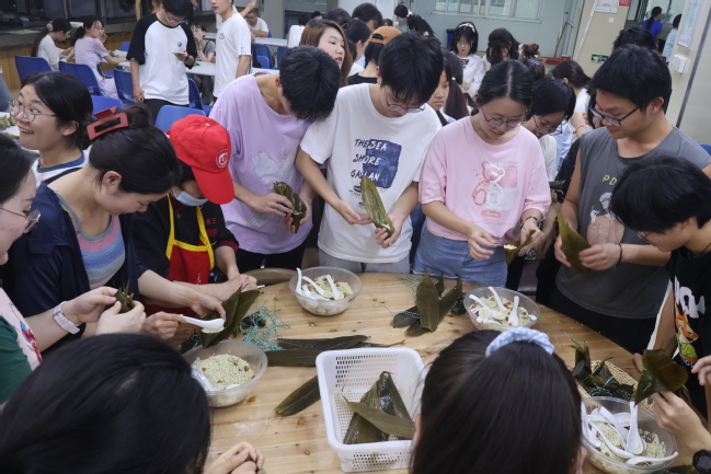 在包粽子区,跟随着餐厅工作人员的示范手法,同学们兴奋又认真地学习包粽子:折粽叶、填糯米、放佐料、裹叶子、扎线……一道道工序有条不紊。不一会儿,桌面上就呈现出一个个棱角分明的粽子。在包饺子区,来自天南地北的同学大展身手、互相切磋饺子的不同包法,一个个形态各异的饺子在同学们的巧手中诞生,整齐码放在盘子上。待热腾腾的粽子、饺子上桌后,“品鉴官”们迫不及待地品尝这节日的味道。