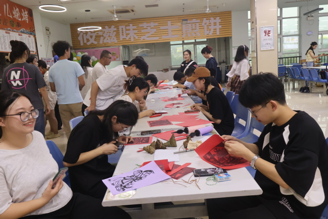 相较于“品味端午”区的热闹,另一边的“文化传承”区则显得悠然自得、气定神闲,同学们在各色宣纸上书写“端午安康”“才华出粽”“守正创新”“感恩奋进”等寄语,用剪刀、刻刀在彩纸上雕镂祖国壮美河山、花鸟鱼虫图案、中国梦寄语等。同学们无不沉浸于中华优秀传统文化的美学意境与深厚内涵中。