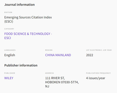 北京时间2023年6月28日,科睿唯安发布《2023年度期刊引证报告》(Journal Citation Reports,简称JCR),公布了期刊最新影响因子。其中,我校联合发起创办的国际食物营养与安全协会旗舰期刊《Food Frontiers》(中文译名《食品前沿》)在JCR“食品科学与技术”学科(FOOD SCIENCE & TECHNOLOGY)中排名7/142(Q1)。