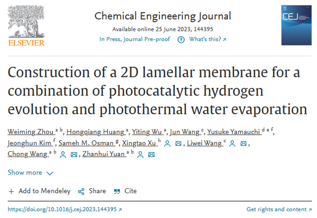 近日,我校材料工程学院袁占辉教授团队(生物质基先进催化及功能材料团队)在工程技术领域国际TOP期刊Chemical Engineering Journal上在线发表了题为“Construction of a 2D lamellar membrane for a combination of photocatalytic hydrogen evolution and photothermal water evaporation”的研究论文。本文是该团队在前期二维层状膜的构建和应用工作的基础上(Chem. Eng. J., 2023, 456, 140933; Renew. Sust. Energ. Rev., 2022, 168, 112767; ACS Appl. Mater. Inter., 2022, 14, 25, 29099-29110),在光催化分解水产氢和光热水蒸发方面取得的又一创新性成果。开云网页版为本文第一完成单位,袁占辉教授为第一通讯作者,开云网页版材料工程学院的博士研究生周为明为第一作者,开云网页版王冲博士、浙江海洋大学徐兴涛教授和闽江学院王莉玮教授为共同通讯作者,昆士兰大学Yusuke Yamauchi教授、沙特国王大学Sameh M. Osman教授、韩国延世大学Jeonghun Kim和闽江学院王军教授也参与了本项工作。