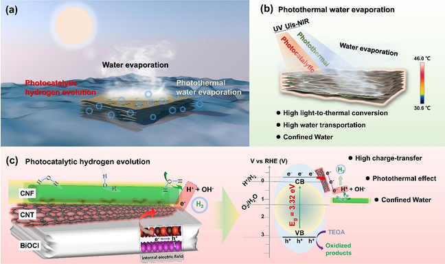 太阳能可以帮助解决能源和水资源短缺的危机。开发一种同时具有光催化析氢和光热水蒸发性能的材料可以同时实现绿色能源和淡水供应。基于传统二维半导体氯氧化铋(BiOCl)纳米片和一维的纤维素纳米纤维(CNFs)、碳纳米管(CNTs)和CNF@CNT自组装体,本研究设计并制备了系列二维层状膜,探讨了其在光催化析氢和光热水蒸发中的联合应用。研究结果表明,光催化析氢和光热水蒸发的性能与太阳能的转换效率和水分子的状态密切相关。由于BiOCl与CNF@CNT构建的二维层状膜(BOC-CNF@CNT)的光热转化率高、水传递能力强、受限水蒸发焓低,其表面温度可迅速达到46.6 ℃,光热水蒸发速率可达2.05 kg·m−2·h−1。此外,由于光生载流子传输快、光热效应强以及受限水的作用,BOC-CNF@CNT的光催化析氢速率是BiOCl与CNFs二维层状膜(BOC-CNF)的1.99倍,是BiOCl与CNTs二维层状膜(BOC-CNT)的1.42倍。本研究为综合利用太阳能同时生产清洁氢气和淡水提供了新的有效策略。综上所述,复合二维层状膜的光催化析氢和光热水蒸发的机制如图2所示。