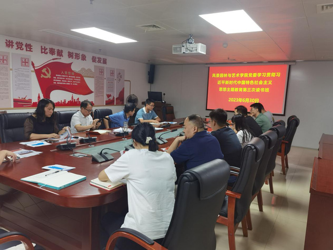 6月30日上午,风景园林与艺术学院党委在学院1102-4会议室开展学习贯彻习近平新时代中国特色社会主义思想主题教育第三次读书班学习研讨暨党委理论学习中心组专题学习会。会议由学院党委书记雷国铨主持,学院领导班子成员、科级干部、辅导员参加。