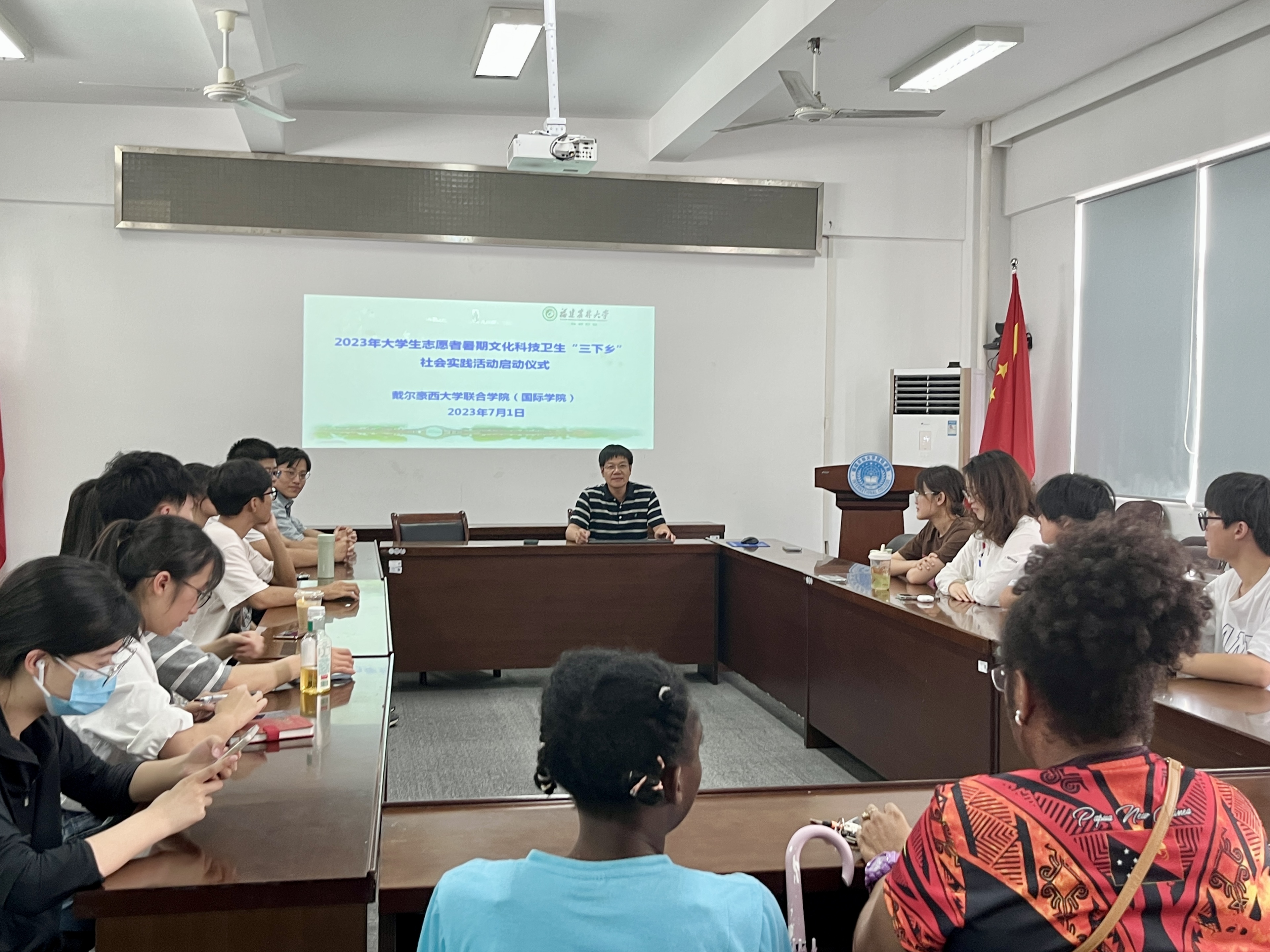 7月1日下午,戴尔豪西大学联合学院(国际学院)在明北附303教室举行2023年大学生志愿者暑期文化科技卫生“三下乡”社会实践活动启动仪式。会议采取线上和线下相结合的方式同时进行,学院团委书记王庆丰、实践团队指导老师及成员参加会议。