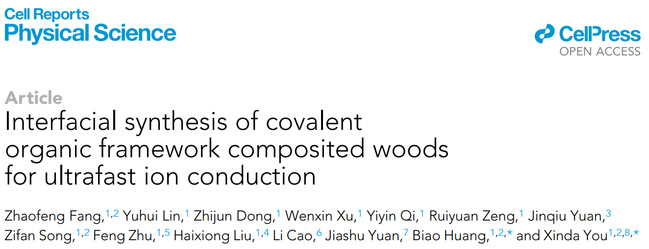6月29日,我校材料工程学院生物质化学工程与机能材料团队游昕达副教授在Cell Reports Physical Science发表了题为“Interfacial synthesis of covalent organic framework composited woods for ultrafast ion conduction”的研究论文,该研究通过界面合成技术制备了共价有机框架复合木材并将其应用于离子传导器件。该制备方法绿色、便捷、高效、通用,为木材高值化利用提供了新思路与新方法,相关成果已申请发明专利(CN202211253352.9)。
