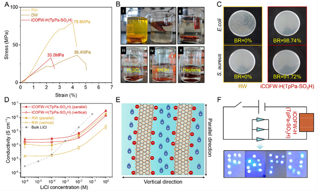 团队提出界面限域策略制备了离子型共价有机框架(Ionic covalent organic framework, iCOF)复合木材,其中木材可提供定向传质通道,iCOF荷电基团作为离子传输位点。制备过程中,亲水木材基质可储存水相氨基单体并与油相醛基单体反应,利用油-水界面将晶体的反应-结晶过程限制在木材内部,在外部溶液中并不形成产物,进而提高COF生长效率并获得高结晶度。作为概念验证,基于TpPa-SO3H COF的复合木材展现出优异的锂离子传导率(7.0×10−4 S cm−1)和机械强度(33.0 MPa),可在模拟电路中作为离电导体使用。此外,TpPa-SO3H COF的强荷电性赋予了木材接触杀菌机制,在不释放有害杀菌剂的前提下抵御细菌与真菌侵染,有效避免了木质离子导体在潮湿环境应用的霉变问题。该界面合成技术可实现复合木材的批量制备和溶剂循环利用,并拓展至不同类型树种和iCOFs,为新型木质离子导体的设计开发与绿色制备提供新途径。