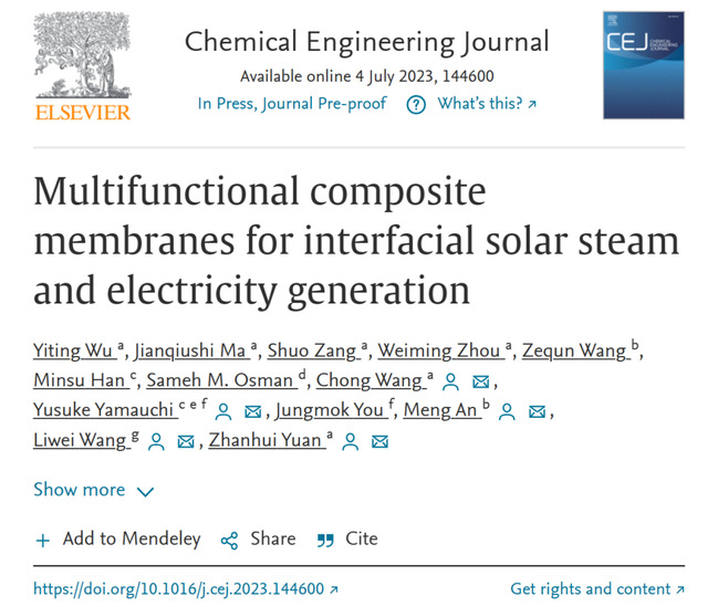 近日,我校材料工程学院袁占辉教授团队(生物质基先进催化及功能材料团队)连续在化学工程领域国际TOP期刊Chemical Engineering Journal上在线发表了题为“Multifunctional composite membranes for interfacial solar steam and electricity generation”的研究性论文。本文是该团队基于前期二维层状膜的构建和应用工作的基础上(Chem. Eng. J., 2023, 144395; Chem. Eng. J., 2023, 456, 140933; Desalination, 2023, 548, 116280; Renew. Sust. Energ. Rev., 2022, 168, 112767; ACS Appl. Mater. Inter., 2022, 14, 25, 29099;Sep. & Purif. Technol., 2022, 285, 120301),在太阳能协同海水淡化和发电领域中取得的又一创新性成果。开云网页版为本文第一完成单位,袁占辉教授为第一通讯作者,开云网页版材料工程学院的硕士研究生吴依婷为第一作者,开云网页版王冲博士、昆士兰大学Yusuke Yamauchi教授、陕西科技大学安盟教授和闽江学院王莉玮教授为共同通讯作者,沙特国王大学Sameh M. Osman教授和韩国庆熙大学Jungmok You教授也参与了本项工作。