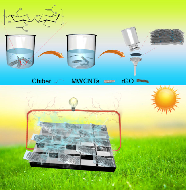 近年来以太阳能界面蒸发(ISSG)为代表的新兴净水技术发展迅速。通过微孔薄膜和高效光热材料的结合,ISSG协同生产淡水和电力是解决淡水短缺和能源需求有前途的方案。在这项研究中,我们开发了由二维材料还原氧化石墨烯(rGO)和一维材料甲壳素纤维@多壁碳纳米管(Chiber@CNT)构建的复合薄膜。通过混合维度设计集成优势,获得具有独特层状多孔结构和优异宽带吸收的复合薄膜。值得注意的是,在1 kW·m-2阳光照射下,复合薄膜的水蒸发速率达到2.10kg·m-2·h-1,光热转换效率为75.79%。此外,基于多孔纳米材料中的自然水蒸发发电的能量收集策略,该复合薄膜成功地实现了淡水和电力的协同应用。在3.5 wt% NaCl溶液中,输出电压达到0.39 V。薄膜的输出电压随着NaCl溶液浓度的变化而变化,从0.26V(在去离子水中)增加到0.45V(在饱和NaCl溶液中)。分子动力学模拟结果表明,发电量的变化可归因于甲壳素纤维(Chiber)中离子与亲水官能团之间原子间相互作用强度的差异。综上所述,复合薄膜的制备流程和太阳能驱动海水淡化和发电示意如图2所示。