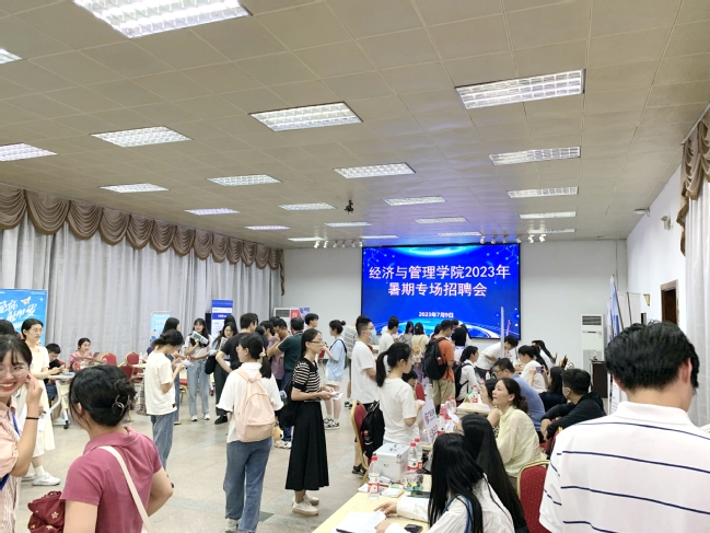 为深入贯彻落实党的二十大精神,认真落实全省高校毕业生就业工作视频调度会精神和学校2023届毕业生就业创业工作推进会决策部署,凝心聚力促进学院2023届未就业毕业生顺利就业,7月9日,经济与管理学院于校大学生活动中心百悟讲坛举办2023年暑期专场招聘会。省督导组成员、校学工部部长肖红新、副部长曹滨斌、学院党委书记张开晃、常务副院长戴永务、党委副书记李健英等多位领导莅临现场指导,学院多位导师、辅导员也参与本次活动。