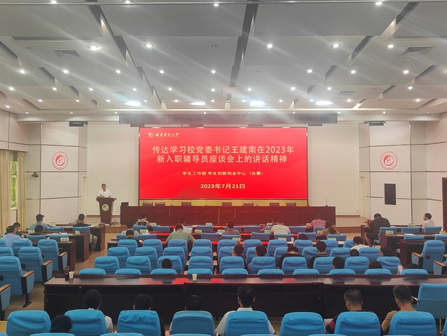 7月21日下午,学工部在禧强楼学术报告厅召开全体辅导员大会,传达学习校党委书记王建南在2023年新入职辅导员座谈会上的讲话精神。学工部全体工作人员、各学院分管学生工作副书记,以及全体专兼职辅导员参加会议。